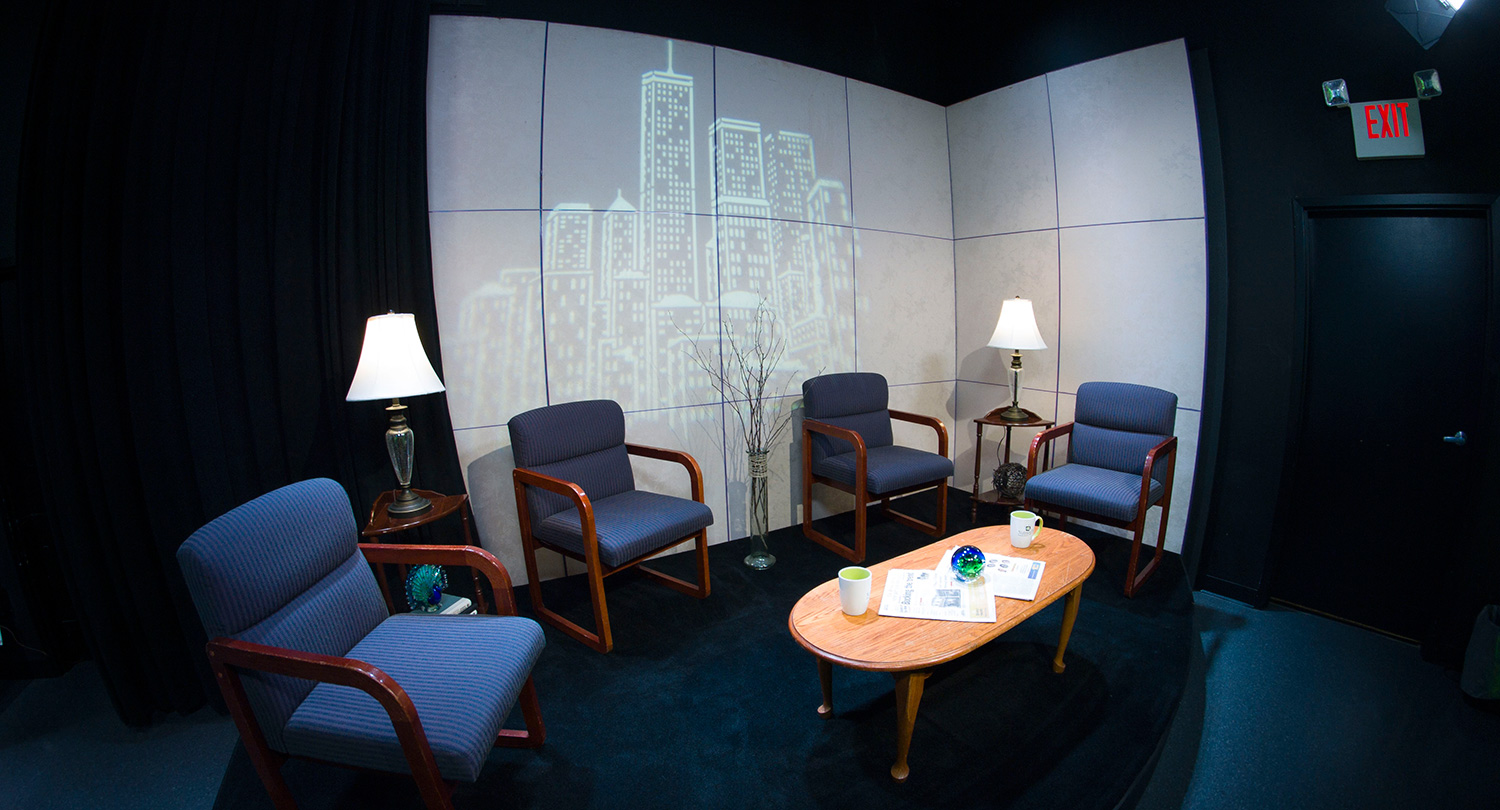 Our 1,400 square foot Studio 1 will give you what you need for your video project or campaign. Complete with a 15 x 15 foot Fiberglass Green Screen Cyclorama, it also offers a Broadcast Set with change-out sign panels, custom LED lighting, two large screen TV monitors, and professional broadcast anchor desk. The studio also offers a fully working customizable Kitchen/Hobby Display Set, and a four person Interview Set. The lighting grid houses over 40 RGB LED lights staged by Emmy Award winning industry pros and broadcast quality cameras with a broadcast quality Control Room round out Studio 1. Prefer your own gear? Bring it with you through our studio access doors, loading dock or ramp.